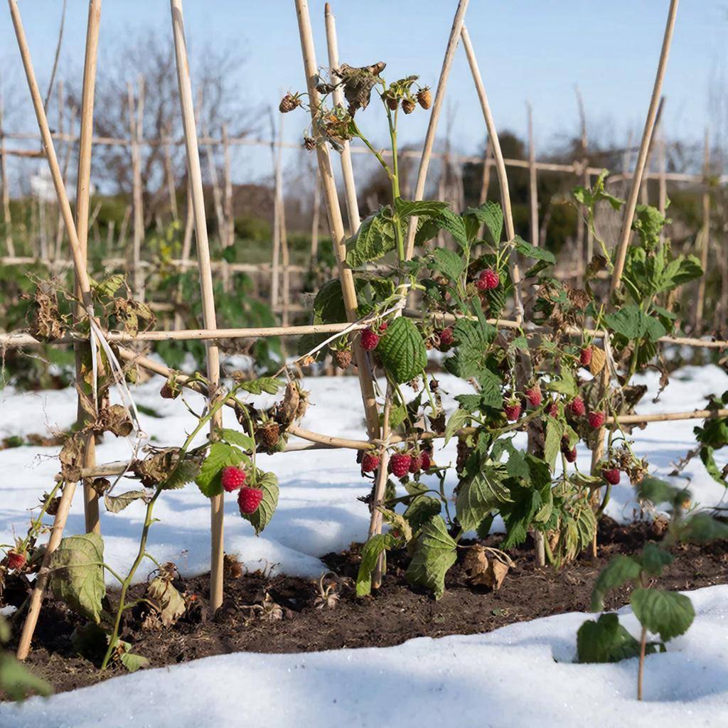 Опустите побеги малины к земле и закрепите их с помощью веревок или скоб, накройте сверху лапником или плёнкой для защиты от мороза. Процесс лучше осуществлять в два этапа: сначала слегка согните их, дайте им привыкнуть к новому положению, а затем прижмите сильнее. В регионах с большим снегопадом оставьте расстояние между землёй и побегами 30-40 см, а при малоснежной зиме – около 20-25 см.