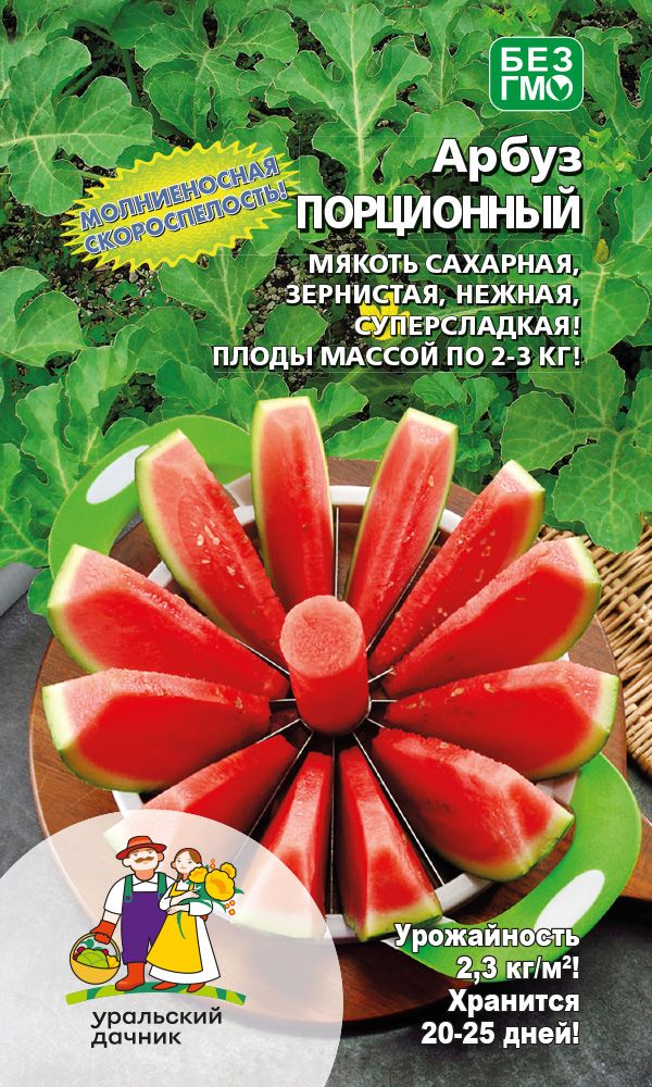На участке можно выращивать любой вид арбуза, но на практике лучше ориентироваться на порционные сорта. Ключевая особенность таких арбузов – скороспелость, сахаристость, «ремонтантность». Представляем вам новый раннеспелый сорт для выращивания на Урале и в Сибири. Некрупные порционные плоды в красивой «рубашке» достигают массы 2-3 кг. Мякоть насыщенно-красная, сочная, вкусная, с высоким содержанием сахара. Такая ягода съедается семьёй за один раз и нет необходимости хранить разрезанный арбуз в холодильнике, где он теряет вкус и витамины. Урожайность 2,3 кг/м2. Плоды сохраняют товарные качества в течение 20-25 дней после съёма.
