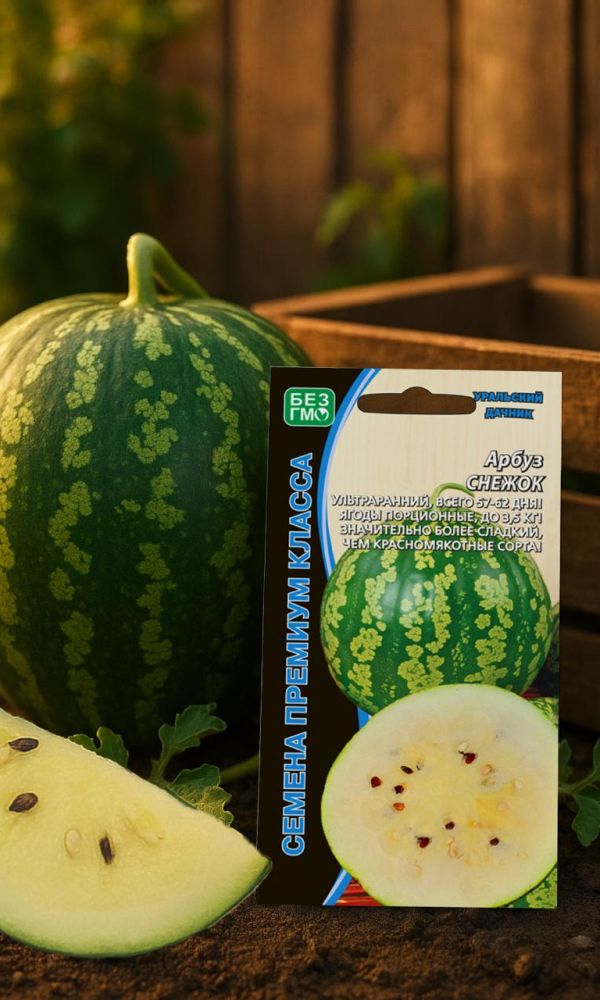 Необыкновенно красивый, поистине диковинный сорт арбуза с белой мякотью. Ультраранние сроки созревания позволяют получать спелые плоды даже в открытом грунте средней полосы. Период от появления всходов до уборки первого урожая всего 57-62 дня! Растение компактное, в южных регионах за сезон формирует около 7 порционных арбузов массой до 3,5 кг. В средней полосе рекомендуется ограничить число завязей до 4-5. Мякоть не содержит аллергенов, малосемянная, более нежная, сочная и сладкая, чем у традиционных сортов. Этот арбуз однозначно станет любимым десертом вашей семьи!