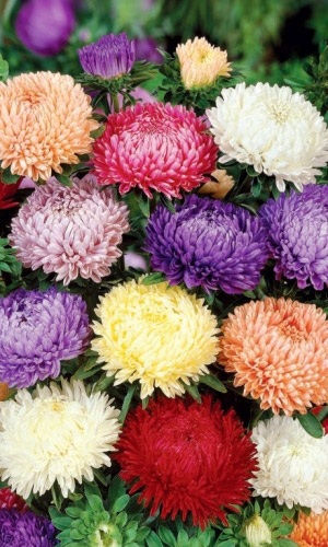 ОднолетнееВеликолепная смесь окрасок высокорослых, обильноцветущих астр, с крупными, густомахровыми соцветиями. Кусты широкораскидистые, прочные, высотой 60-70 см. Соцветия-корзинки полусферические, почти шаровидные, похожи на пионовидные, разнообразных окрасок. Декоративная ценность соцветий сочетается с компактностью куста, ранним, обильным и продолжительным цветением. Каждое растение формирует до 15 цветоносов. Используется для цветочных аранжировок, оформления цветников, рабаток и на срезку.