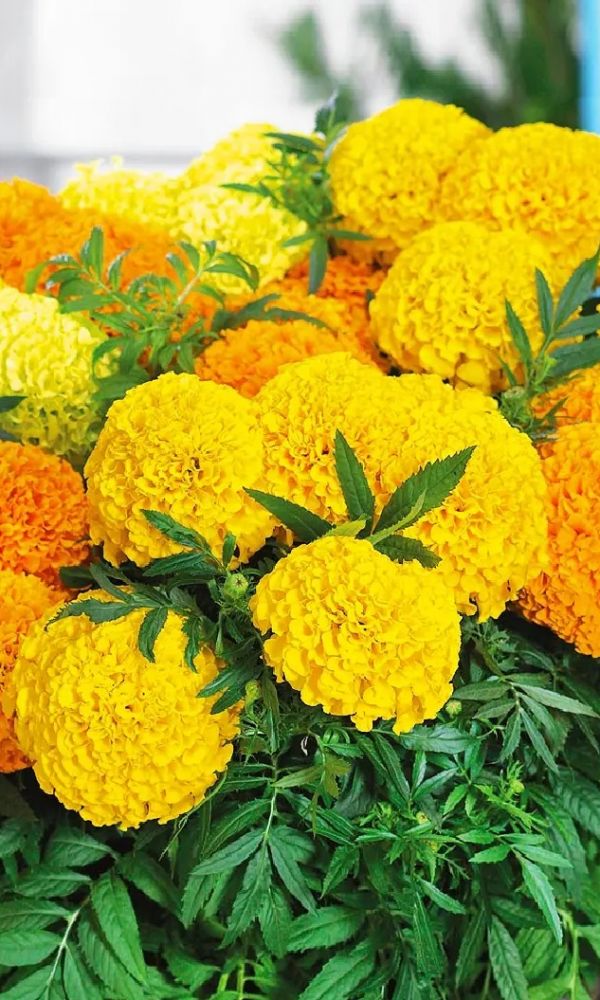 Обильное и продолжительное цветение. Растение высотой до 90 см. Цветки собраны в крупные, махровые и шарообразные соцветия - корзинки, диаметром до 10 см, жёлтой и оранжевой окраски. Цветет с июня до заморозков. Чтобы продлить цветение, необходимо удалять увядшие цветки...