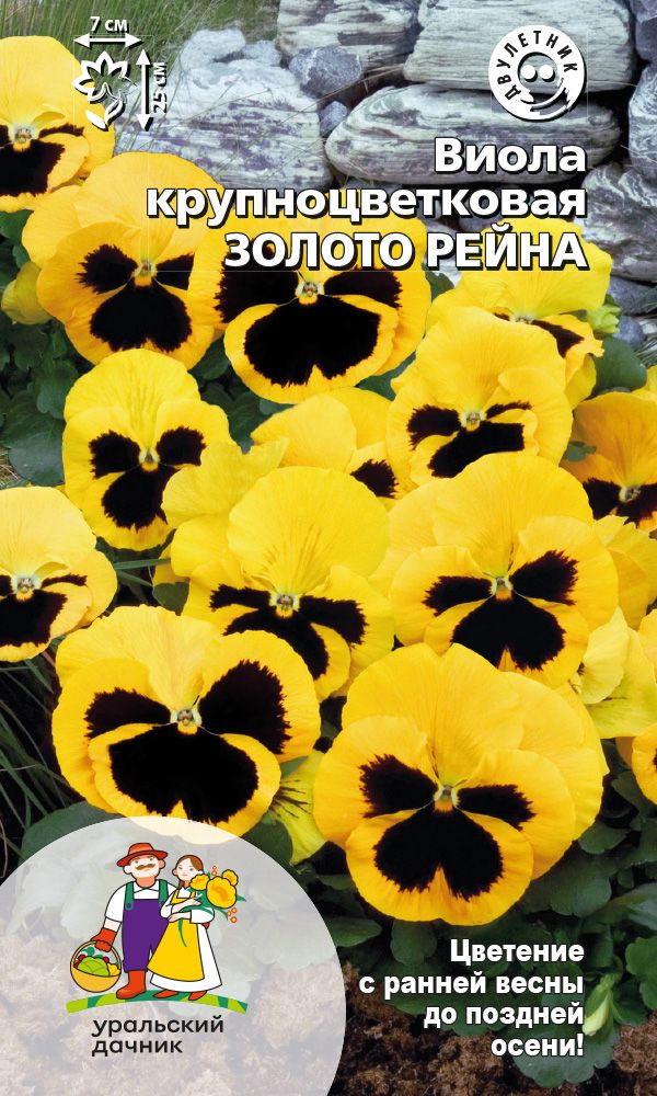 ДвулетнееЭто растение, любимое многими, славится своим обильным цветением и крупными (6-7 см в диаметре) ярко-золотистыми цветами с тёмным пятном в центре. Цветы обладают приятным ароматом и привлекают внимание. Растение не требует особого ухода, оно зимостойкое и сильноветвистое, достигая высоты 15-25 см. Виолы легко переносят пересадку, что позволяет высаживать их на постоянное место уже цветущими.