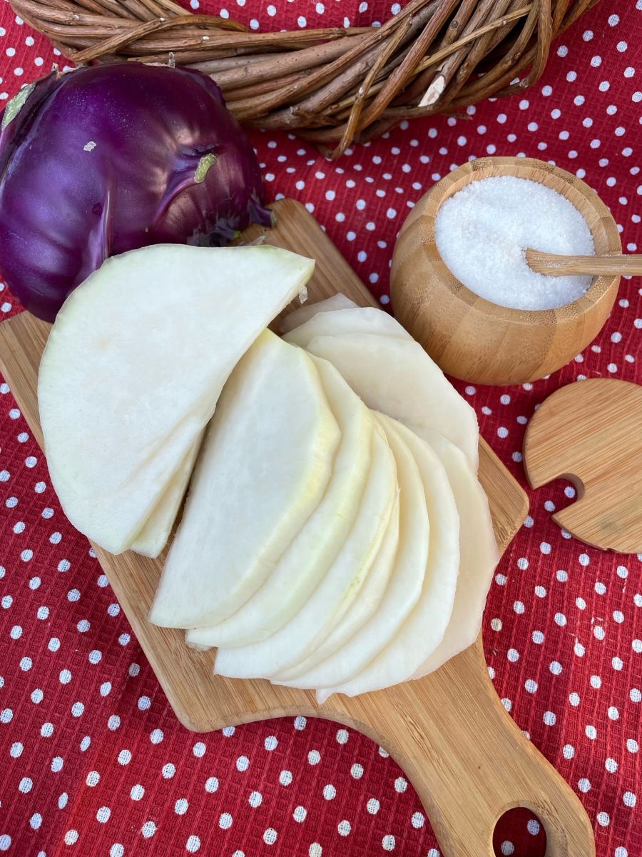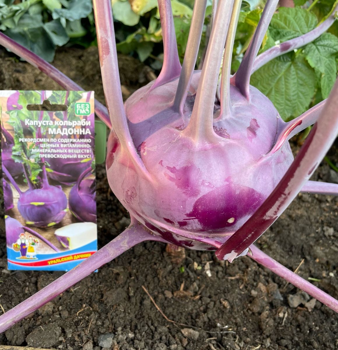 Высокоурожайный, среднеспелый (110-130 дней) сорт. Розетка листьев полувертикальная. Стеблеплод среднего размера, широкоэллиптический, кожура светло-фиолетовая. Мякоть белая, нежная, сочная, сладкая, хрустящая, без горечи. Масса 500-700 г (до 1,3 кг). Вкусовые качества отличные.