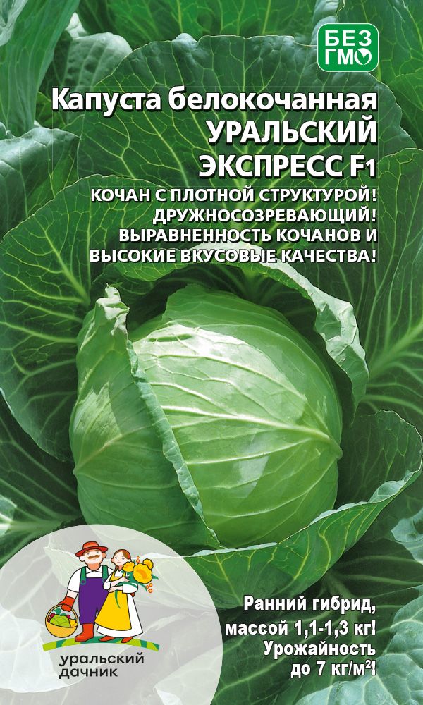 Ранний гибрид белокочанной капусты. От высадки 40-дневных саженцев до сбора урожая проходит 46-48 дней. Листовая розетка полуприподнятая, лист средний, тонкий, зелёный, слабопузырчатый со слабым восковым налётом. Кочан зелёный, округлый, с плотной внутренней структурой, весом 1,1-1,3 кг. Дружносозревающий. Отличается выровненностью кочанов и высокими вкусовыми качествами. Капуста Уральский экспресс F1 устойчива к растрескиванию. Гибрид генетически устойчив к фузариозному увяданию. Его используют для употребления в свежем виде и домашней кулинарии. Урожайность составляет 5,5-7 кг/м2.