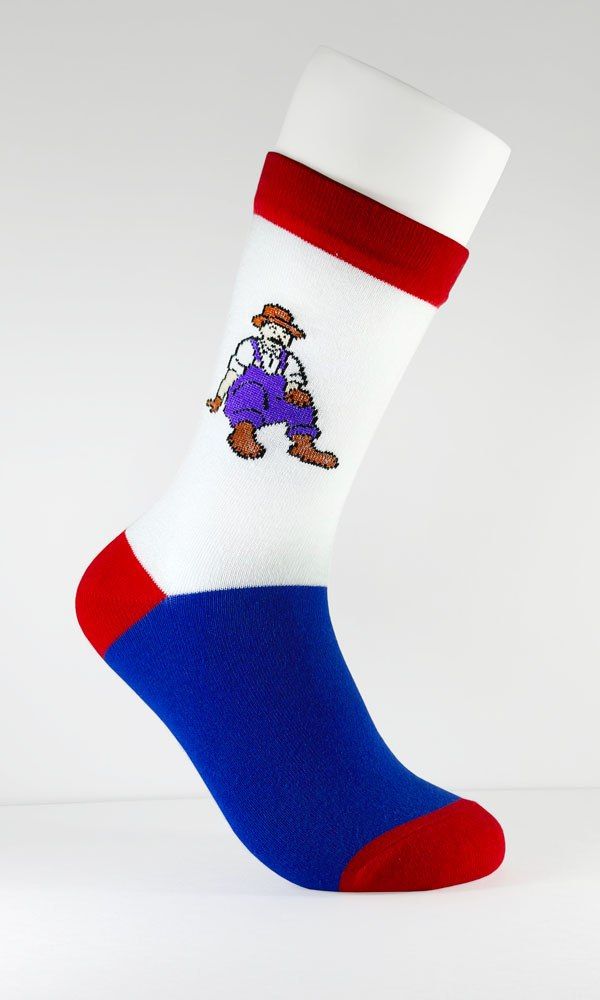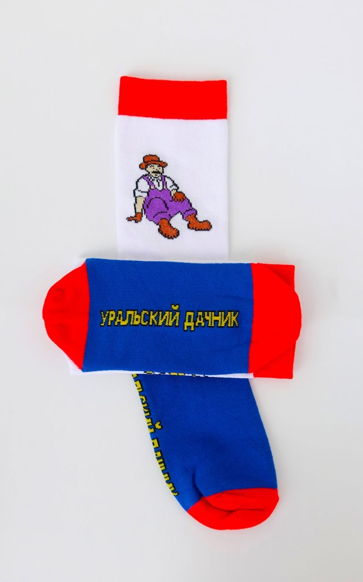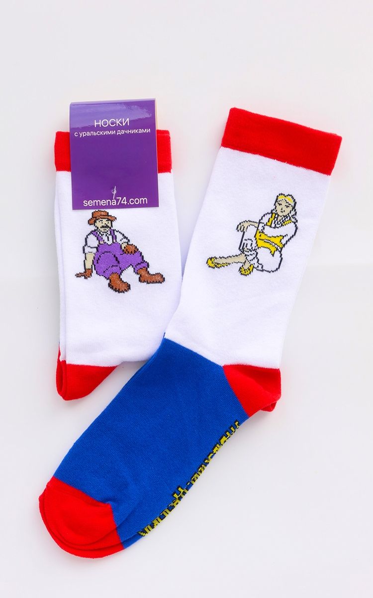 Оригинальные персонажи, знаменитые уральские дачники присели на полянке сразу над вашими лодыжками, оригинальная ретро палитра синего фона и красной полосы отражена в этом дизайне. Стиль 2022 года. Носим и проникаемся историей компании, садоводства, культуры!