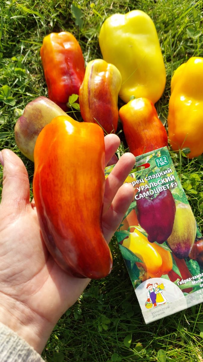 Современный среднеспелый гибрид Челябинской селекции для открытого грунта и плёночных теплиц. Растение полураскидистое, средней высоты. Плод пониклый, конусовидный, глянцевый, окраска в технической спелости фиолетовая, затем переходит в переливы жёлтого, оранжевого и красного. Число гнёзд 3. Масса плода 120 г, толщина стенки 6-8 мм. Плоды отличного вкуса. Универсальное использование.