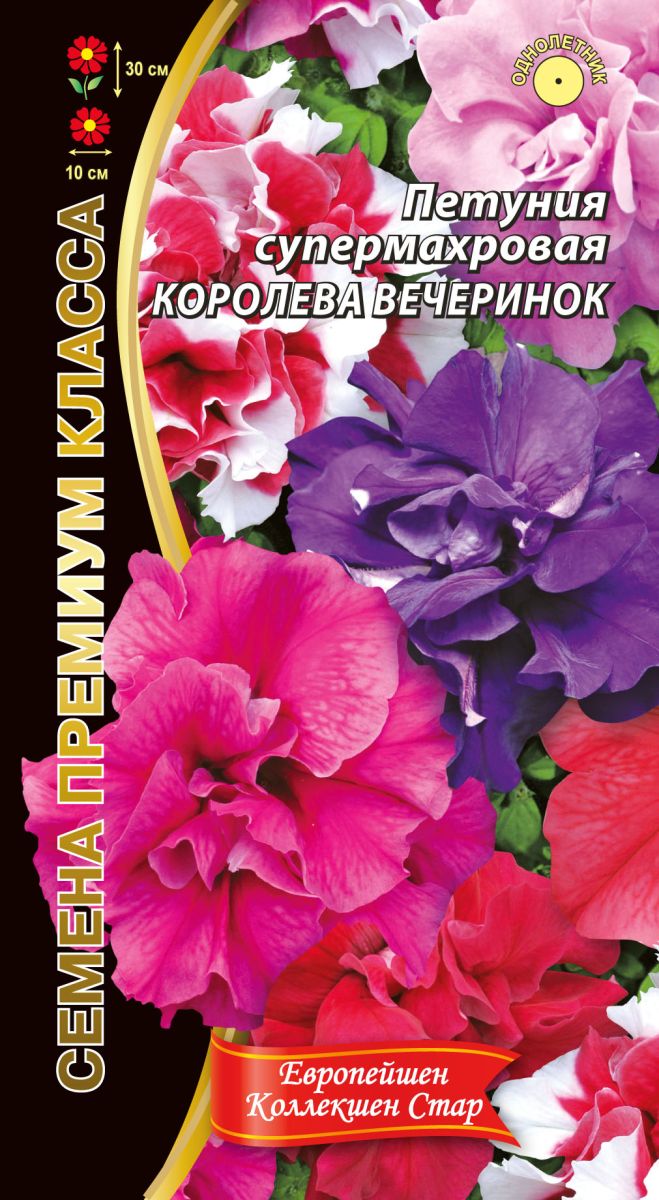 ОднолетнееМноголетнее растение, выращиваемое как однолетнее. Серию "Европейшен коллекшен стар" отличает декоративность, раннее и длительное цветение, устойчивость к неблагоприятным погодным условиям и крупные (диаметр 10 см) махровые цветки. Растение долго сохраняет свою декоративность. Петуния – относительно неприхотливое и очень пластичное растение. Хорошо растёт на солнечных местах, но может выносить и небольшое затенение. К почвам нетребовательна, выносит засуху, похолодание и небольшие заморозки. Прекрасный материал для создания ярких клумб, бордюров, великолепно смотрится в подвесных кашпо, вазонах и балконных ящиках.