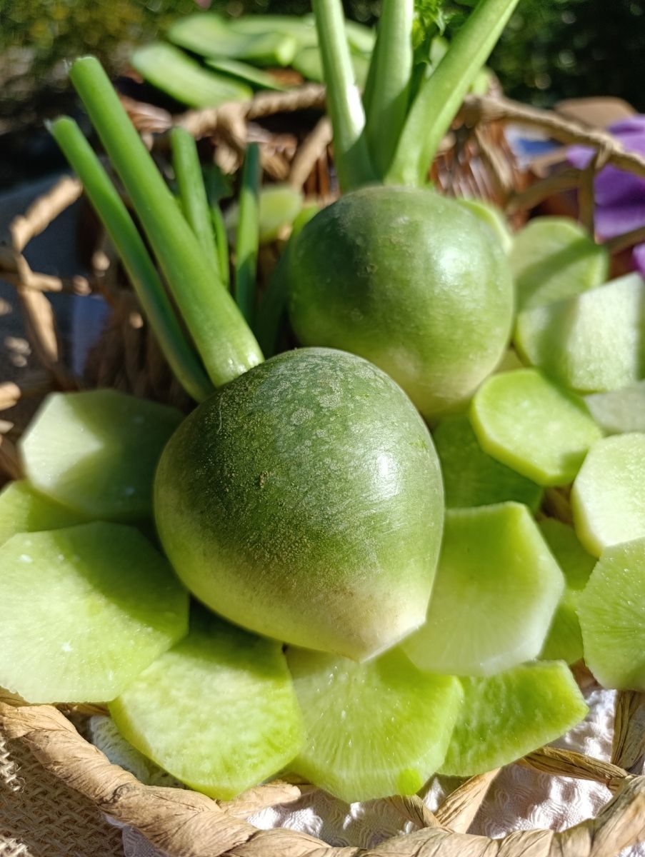 Корнеплоды гладкие, мягкого зелёно-мятного цвета, с белым «носиком» – очень аппетитные и явно напоминают героя мультфильма. Мякоть хрустящая, без горечи: свежий салат из натёртой лобы, приправленный деревенской сметанкой, – вкуснятина необыкновенная!