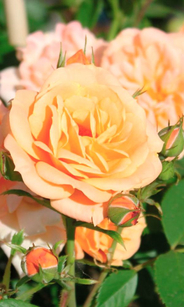 Куст крепкий, компактный, высотой 40-60 см и шириной до 50 см. Побеги плотные, иногда с лёгкой колючестью. Листва мелкая, блестящая, тёмно-зелёная. Цветки махровые, диаметром 4-5 см, собраны в кисти по 5-10 штук. Окраска абрикосовая с розовым и оранжевым оттенком, может светлеть на солнце; в дождливую погоду возможны лёгкие «веснушки». Аромат лёгкий. Цветение обильное, повторное, почти непрерывное с июня до заморозков. Цветки держатся 2-3 дня, после чего самоочищаются.