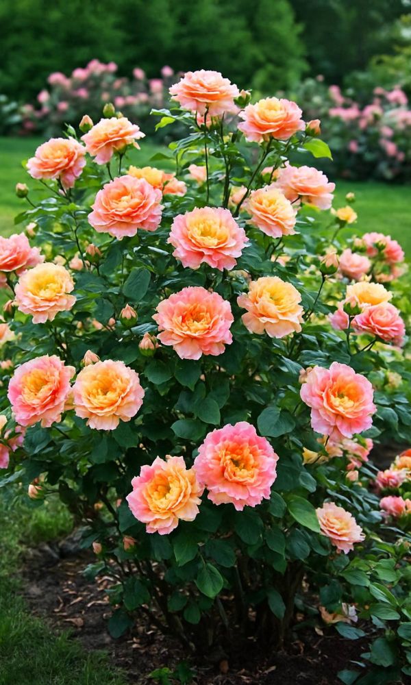 Куст формирует сильные, прямостоячие побеги и достигает высоты 120-150 см при ширине около 70 см. Листва плотная, тёмно-зелёная, хорошо контрастирует с яркими цветками. На побегах распускаются как одиночные цветки, так и небольшие соцветия – обычно 1-3 бутона на ветку.